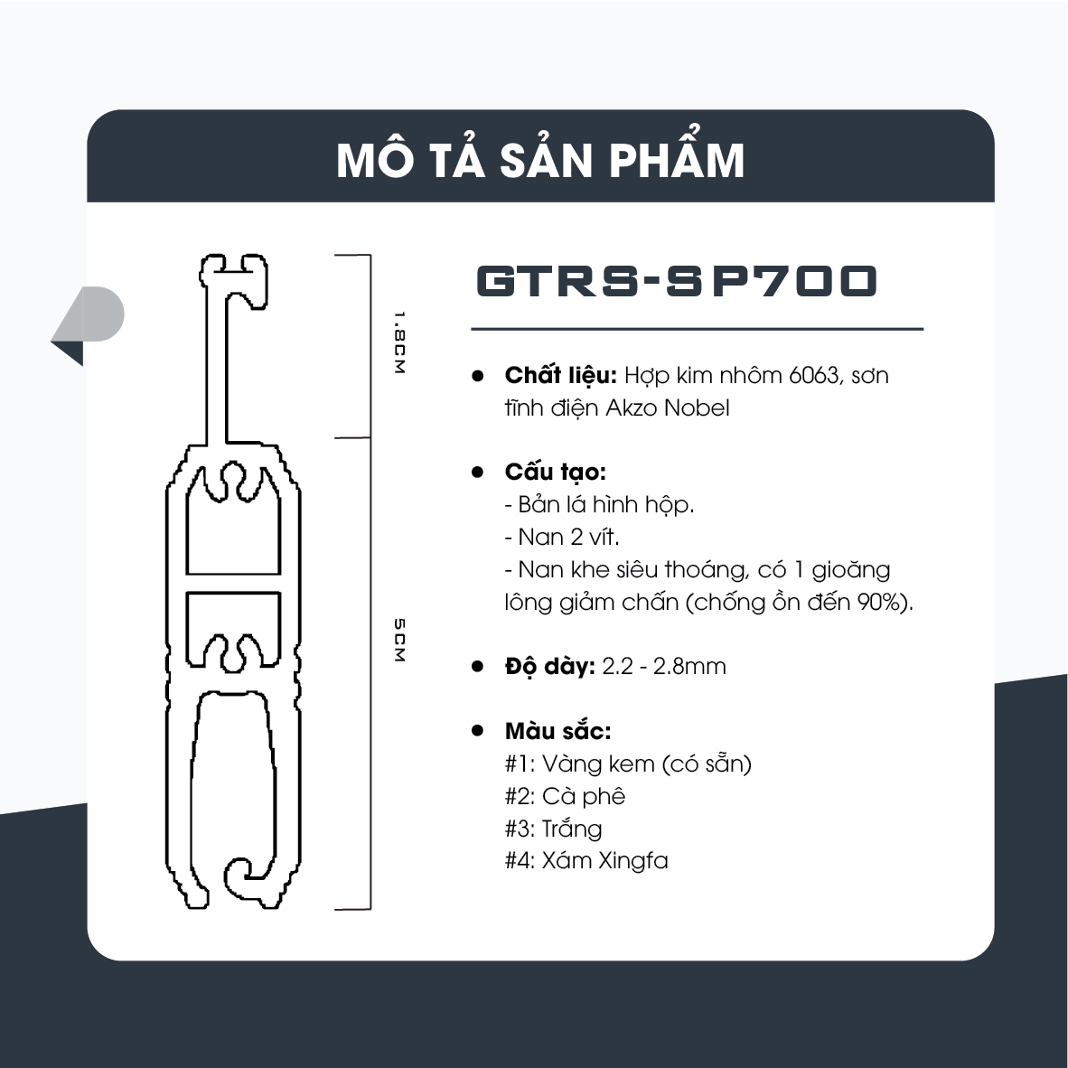 – Hợp kim nhôm 6063, sơn tĩnh điện Akzo Nobel.