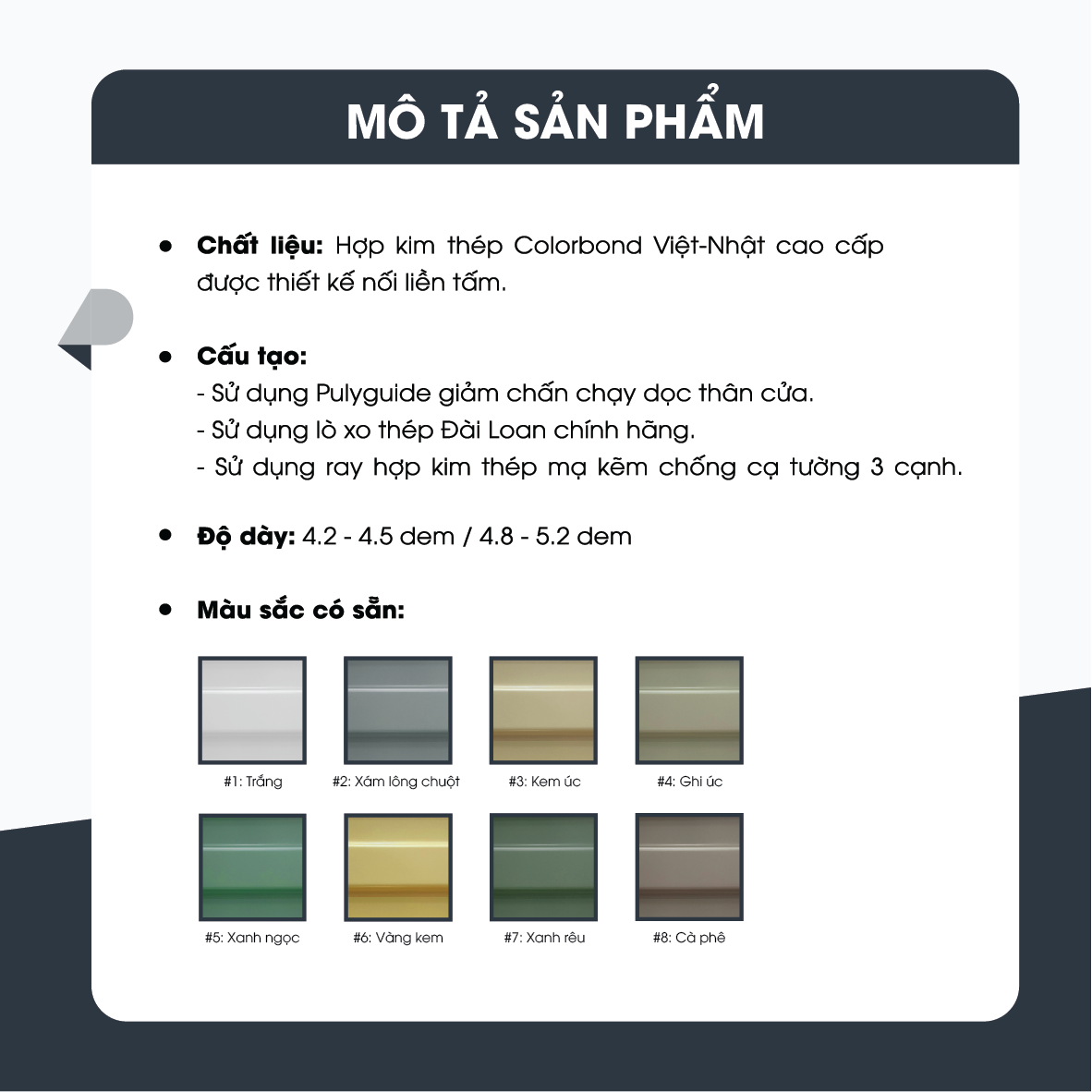– Cặp màu sắc: Ghi Úc ngoài – Kem Úc trong